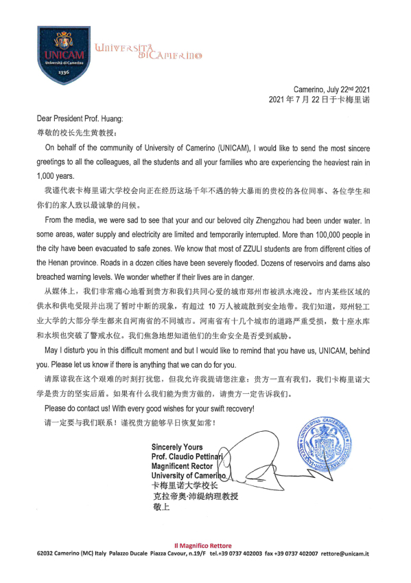 意大利卡梅里诺大学校长Claudio Pettinari来信对我省及我校内涝情况表示关切,向我校全体师生及家人致以问候。他表示卡梅里诺大学是我校坚实后盾,愿提供力所能及的帮助;澳大利亚格里菲斯大学副校长来信,对我校遭受的汛情表示同情,他希望来自格里菲斯大学的问候能给予我校师生员工必胜的信心;卡梅里诺大学高等研究院院长Roberto Ciccocioppo教授在来信中写道“卡梅里诺大学高等研究院以及卡梅里诺大学都心系贵校。我希望,我们之间的友谊能给你们带去动力,帮助贵校尽快从灾害中恢复。” 此外荷兰方提斯应用技术大学、英国爱丁堡龙比亚大学、美国奥克兰大学、美国纽约州立布法罗学院、美国新墨西哥州立大学、澳大利亚格里菲斯大学、澳大利亚查尔斯达尔文大学、英国威尔士三一圣大卫大学、爱尔兰沃特福德理工学院等高校、国际友人和曾在我校任教的外籍教师均来电或通过其他方式询问情况,表达关切和慰问。