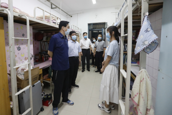何秀敏委员一行先后深入校园实地查看了学生宿舍、食堂、校医院、保卫处监控室、信息化管理中心等重点场所,检查了疫情安全防控落实和应急处置预案情况、留校学生学习生活保障及在校管理情况、师生自我防护、核酸检测和隔离工作情况、值班值守等情况,并就师生摸排、灾后重建、开学准备工作等问题与学校领导进行了交流。