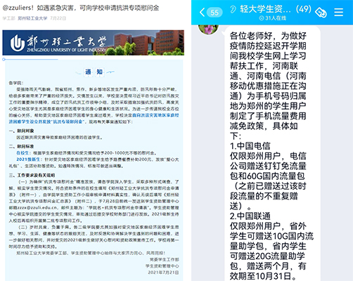 面对汛情和疫情的双重考验,学校启动应急资助,第一时间发布了《关于向洪涝灾害地区家庭经济困难学生发放抗洪专项慰问金的通知》,开通汛期资助救助热线,设立“抗洪专项慰问金”。各学院全面开展对受灾学生的排查工作,广大学工干部、全体辅导员老师通过微信、QQ、电话等形式,“一对一”对省内学生进行“云”家访,建立受灾严重地区学生信息台账,为851名受灾学生发放39.67万抗洪专项救助金,确保“摸排全覆盖、关爱及时到”。秋季学期开学后,学校将为受洪涝灾害影响严重的家庭经济困难学生提供最高档资助,通过“六位一体”资助政策体系为受灾学子筑起抗汛救灾的“资助堤坝”。此外,学生资助管理中心主动对接河南移动、河南联通、河南电信对学生网络学习流量进行补贴,助力保障“停课不停学”。