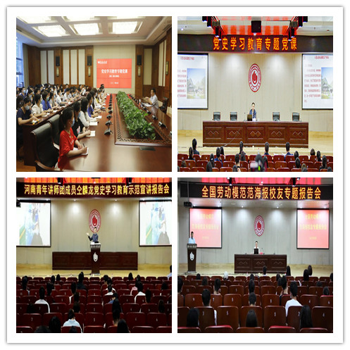 学校领导围绕党史重大事件、重要会议和重要人物,率先上好专题党课。各学院书记、院长结合“开学思政第一课”讲好防汛救灾、疫情防控奋进故事,引导学生“把灾难当教材,与祖国共成长”。学校讲师团、青年讲师团和辅导员宣讲团,精选宣讲题目,深入班级生动宣讲,打造“五维一体”党史宣讲模式,坚定学生信仰信念。特别邀请河南青年讲师团成员、驰援湖北医疗队青年突击队长仝麟龙、全国劳模优秀校友范海报等到校宣讲交流,增强学生“知史爱党爱国、知校爱校荣校”深厚情感。