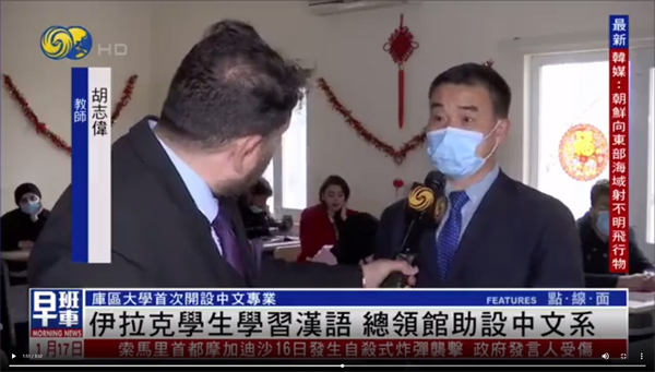 近日,凤凰卫视对伊拉克埃尔比勒萨拉赫丁大学中文系进行报道,采访了我校赴伊公派教师胡志伟,该报道在伊拉克引起热烈反响。