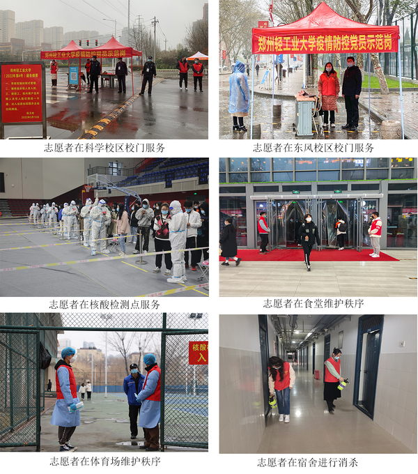 本次疫情防控志愿服务本着“个人自愿申请、党员干部带头”的原则,在学校疫情防控工作领导小组安排指导下开展了多项活动,志愿者们结合自身实际,主动参与防控宣传,线上利用学校官方媒体平台宣传防控知识,线下在服务过程中宣传防控措施和防控要求,传播疫情防控社会正能量。教职工志愿者落实服务下沉一线要求,积极参与校园管理,服务在核酸检测点的教职工志愿者耐心细致,积极维护现场秩序,提醒检测师生做好个人防护;服务在两校区大门的教职工志愿者严把校门关,协助安保人员实施校园封闭式管理工作,对进出校门的人员、车辆进行细致查验,守稳学校疫情防控第一道防线。各学院积极响应,动员学生志愿者在食堂、操场、宿舍等区域服务。食堂的志愿者们积极做好洗手消毒指引、购餐引导、维护秩序等工作,为师生们提供良好的就餐秩序;宿舍的志愿者们协助宿管老师对宿舍走廊等公共区域进行消杀,为同学们营造出健康舒适的住宿环境;校园巡查志愿者在校园公共区域对不规范行为进行及时劝阻和引导,提醒进入教学楼、体育场等区域人员做好防疫措施并发放口罩。全体师生员工层层压实校园疫情防控责任,时刻绷紧思想之弦,确保校园不留安全死角。