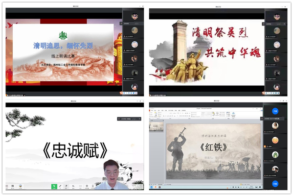 在清明节来临之际,国际教育学院、三实书院、《轻大青年》编辑部等组织学生持续开展“清明追思,缅怀先烈”线上主题朗诵比赛、主题征文等活动。同学们紧扣主题讲述先烈故事、追思先烈遗志、表达爱国之情,以饱满的热情、深情的语言、铿锵的语调将自己对传承革命先烈高尚品格以及爱党爱国的深厚情感赋予在诗歌、文字之中,充分展现了同学们赤诚的爱国热情和朝气蓬勃的精神面貌。广大青年学生立志要以英雄为坐标,脚踏实地学英雄,勤奋上进树榜样。