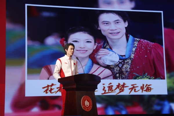 随后,佟健作了题为《花样人生,追梦无悔》的讲座。他通过分享与庞清组合一起夺冠的历程,讲述了从“野孩子”到“世界冠军”的人生经历和经验。从起初的迷茫痛哭到“为了梦想奋力一搏”,从共同约定一起面对重大失误到第一次感受夺冠后升国旗、奏国歌的神圣而庄严的时刻,那些赛场上挥洒的汗水迎着鲜艳的五星红旗,在这一刻全都化为为国争光的无上荣耀。他表示,在追逐梦想的过程中,无论多聪明的人都没办法预见种种抉择到底会将你引向何方,唯有多年后回顾,才可以看出它们彼此之间的关联。希望同学们在面临抉择时,不要着急想结果,而是要坚持奋斗,只要咬牙坚持过、为之奋斗过,无论结果是什么都不会后悔。冠军们的奋斗事迹动人心弦,他们勇于拼搏、坚韧不拔、勇往直前的体育精神振奋人心,令在场师生们深深感动,会场不时爆发出阵阵掌声。