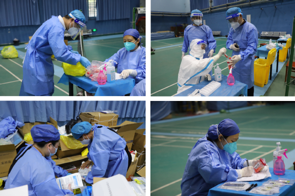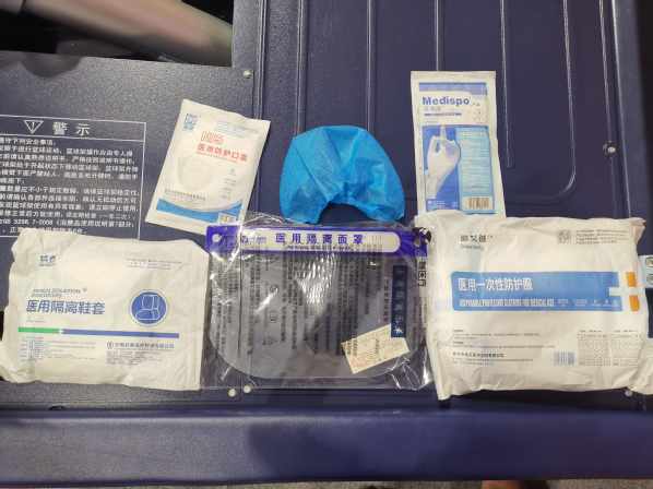 08:25其他志愿者也陆续赶到,大家一起领取防护用品,包括一次性防护服、隔离鞋套、隔离面罩、防护口罩、灭菌橡胶外科手套、医用防护帽六件物品。