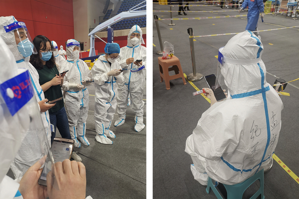 08:40 到岗正是开始工作,在一名老志愿者的指导下,操作手机,熟悉流程。具体流程为:医务人员发放试剂袋——志愿者打开APP——登录账号——选择“郑州轻工业大学”采集地点——点击“开箱”扫描试剂袋上的条码——取出一管试剂并扫描上面的条码——扫描被检测人员“郑好办”二维码——将试剂管交给第一名被检测人员开始采样——扫描、核对信息……。每袋试剂是10管,每管试剂采样20个,接下来就是:扫描——核对确认信息——扫描——核对确认信息……