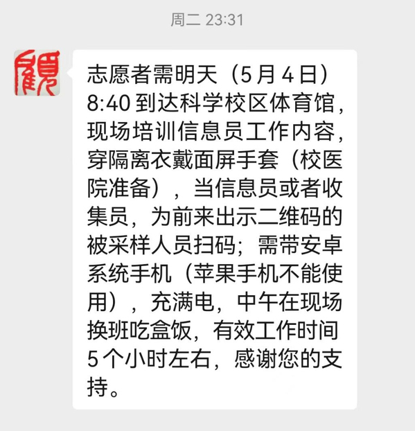 23:31接到通知,安排参加明天核酸检测志愿服务,当“信息员”,负责扫描二维码、录入信息。由于扫描二维码要用到手机,马上给手机充好电备用。心情兴奋,报名当志愿者已经有月余,一直在排队,明天就要成行;同时又有些忐忑,之前没有做过核酸检测志愿者相关工作,不知道自己能否胜任。