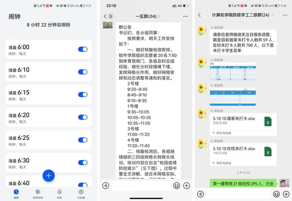 晨光熹微,辅导员们陆续被闹钟叫醒。睁开眼后,辅导员的第一件事便是拿起手机查看新的通知、信息,仔细确认当天工作安排、做好核酸检测准备、督促学生日报告打卡,确保重要信息无遗漏,忙碌的一天伴随着太阳升起拉开帷幕。