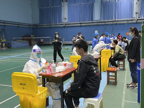 9点20分,核酸检测进入高峰时段,我和志愿者们穿梭在宿舍体育馆之间,做好排队学生的引导工作,提醒同学保持安全距离。