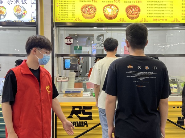 12点10分,在食堂做文明督导志愿者,提醒同学们佩戴口罩,在餐厅内来回巡视,协助餐厅工作人员引导同学们排队打饭,维持良好秩序。