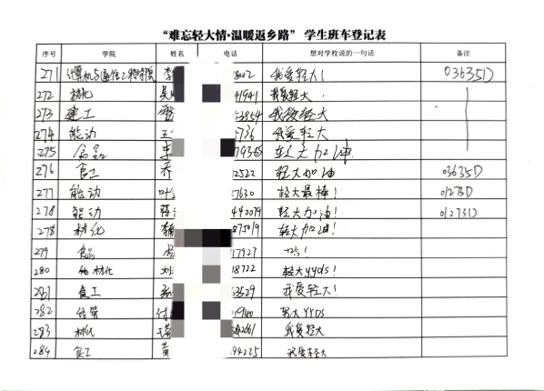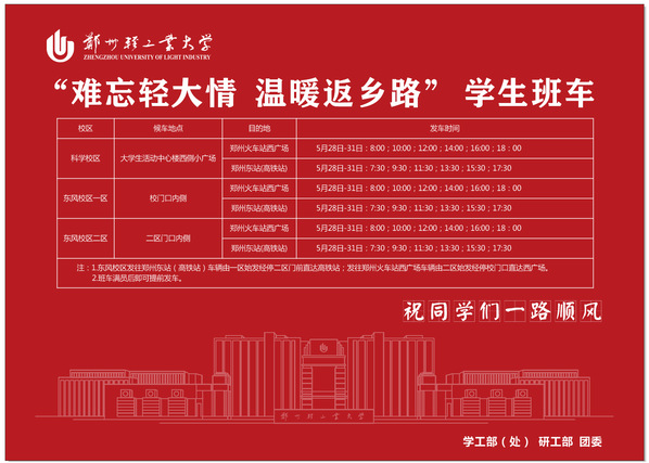 学校为帮助学生安全顺利返家,增强学生爱校荣校意识,经过学工部(处)、研工部、团委的老师们不懈努力,多方协调,反复沟通,最终开通了“难忘轻大情 温暖返乡路”学生班车。