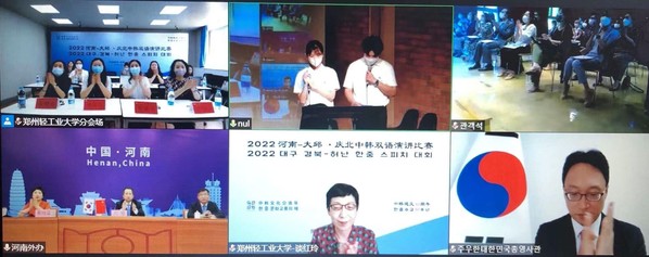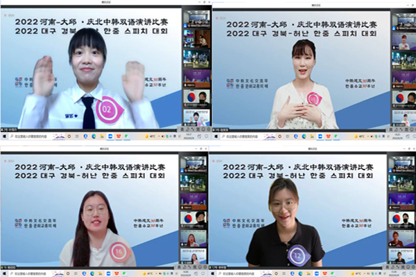 2022年是中韩建交三十周年,也是“中韩文化交流年”。6月24日,由河南省人民政府外事办公室、中国驻釜山总领事馆、河南省教育厅、韩国驻武汉总领事馆、韩国大邱广域市、韩国庆尚北道共同主办,我校与韩国大邱加图立大学承办的2022河南省—韩国大邱庆北地区汉韩语演讲比赛决赛暨颁奖仪式通过线下、线上相结合的方式成功举办。中国驻釜山总领事馆副总领事涂敬昌、韩国驻武汉总领事馆副总领事柳寅植分别为本次大赛致辞。我校国际合作与交流处负责同志应邀出席了本次比赛。