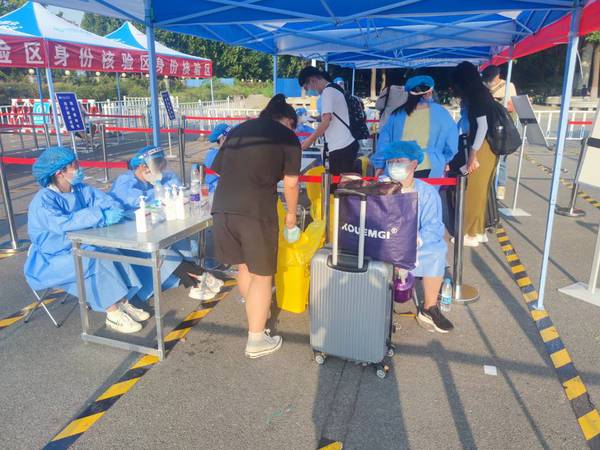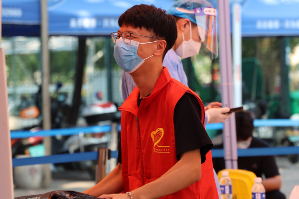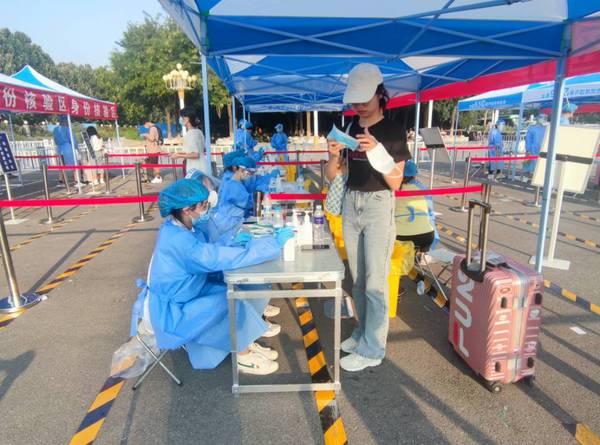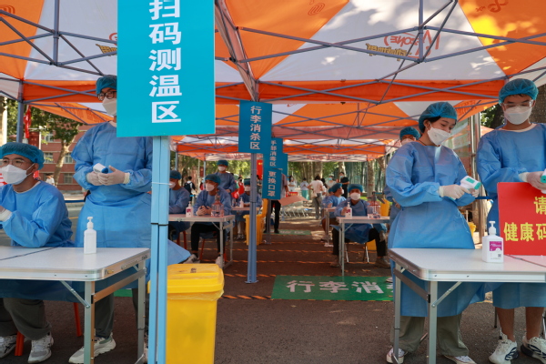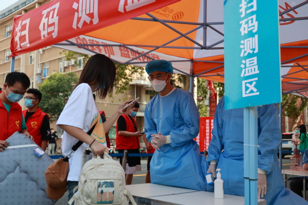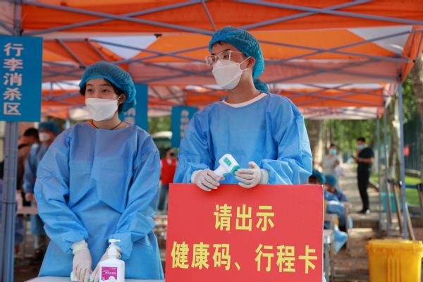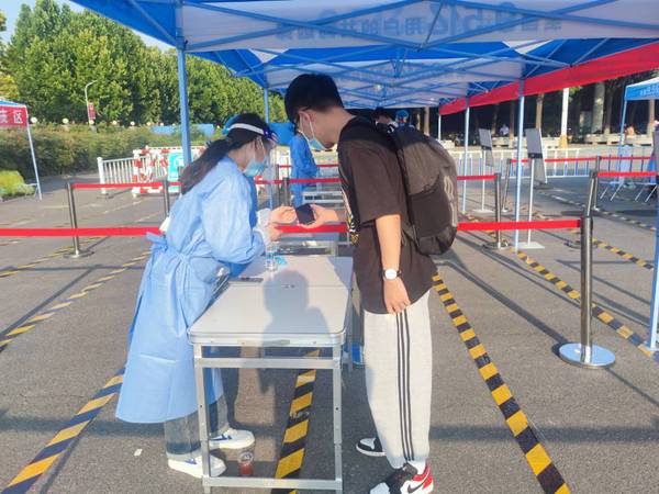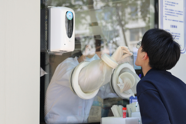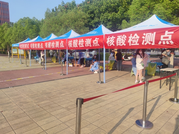 气温虽高,医务人员依然坚守岗位,入校第一步,先来一个核酸,为同学们的安全再加一层防护。