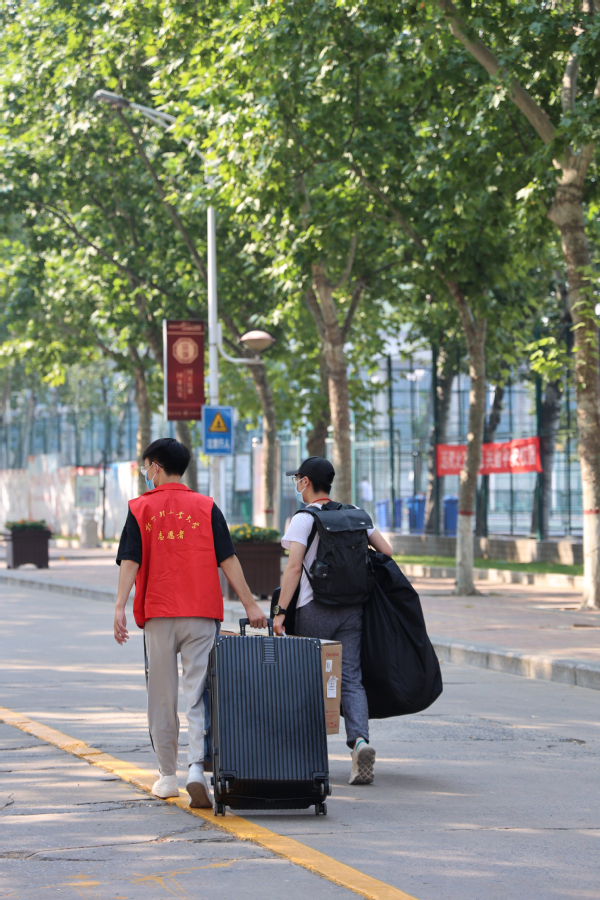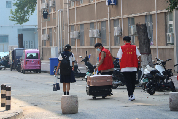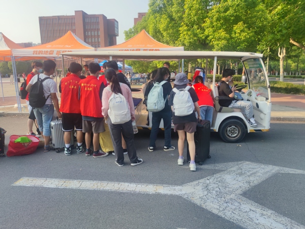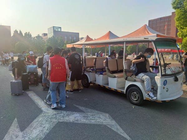 学校门口、绿荫小道,宿舍门口,接过你的行囊,坐上接驳车,熟悉的脸庞,灿烂的笑容。口罩遮不住亲切的话语,马甲在身便是责任。