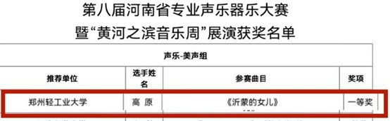 近日,从刚刚闭幕的第八届河南省专业声乐器乐大赛决赛暨“黄河之滨音乐周”展演上传来好消息。我校艺术教育中心高原博士在比赛中荣获声乐-美声组一等奖。这是我校第一次获得该项大赛一等奖,同时也是唯一一个获得一等奖的非音乐专业院校。