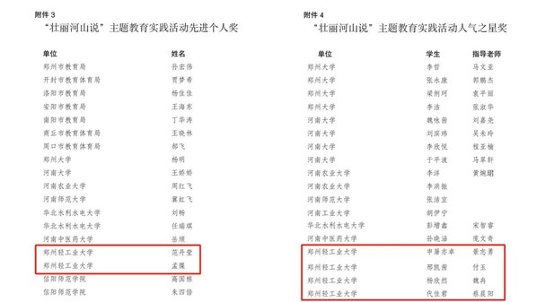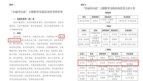 近日,河南省委教育工委、省教育厅组织开展的“壮丽河山说”主题实践活动评选结果公布,我校荣获“优秀组织奖”;校团委报送的视频作品《寻访潢川,传承大别山革命精神》荣获“优秀主讲人奖”二等奖;校团委范丹莹、计算机与通信工程学院孟牒荣获“先进个人奖”;食品与生物工程学院学生申屠亦卓、代佳君、软件学院学生邢凯茜、杨欣然荣获“人气之星奖”。