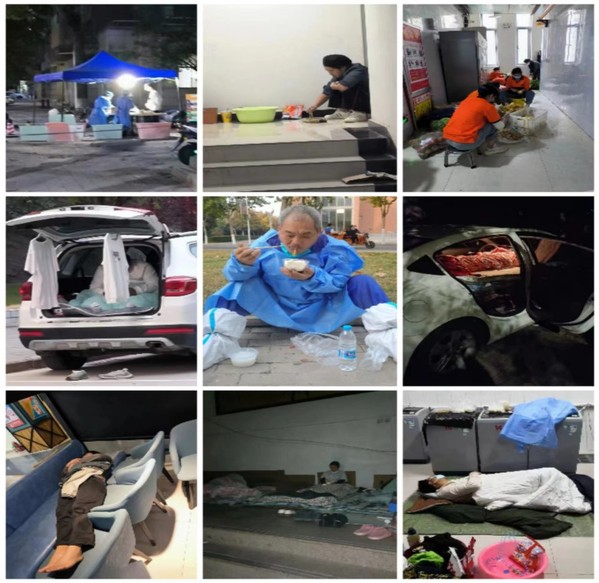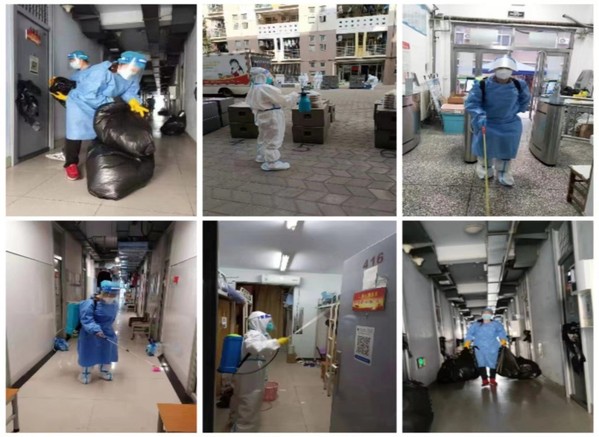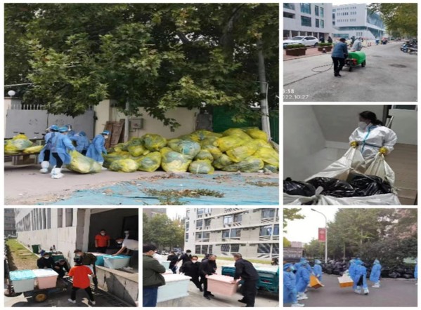 新老校区校园物业的老师们也克服了人员少任务重的困难,全力的投入到防疫保障的工作之中。因疫情封控等原因他们部分减员,但同时要完成了日常的绿化、保洁、消杀,还为其他兄弟部门增添人手、增加支援。校园里到处都能看到他们的身影,有的在卸装学生的生活垃圾,有的在帮助师生调运盒饭,有的帮各部门分发物资,有的给核算检测布置现场,有的背着沉重的喷雾器在消毒,从白天到黑夜,校园物业的员工们不停的在为学校抗疫工作大局贡献着自己的力量。
