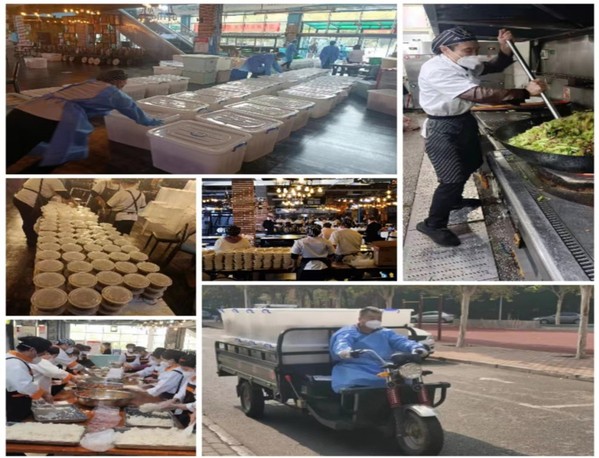 民以食为天,两校区三万多名师生的餐饮保障成了后勤工作的重中之重。为确保食品安全及供应充足,膳食管理科严格遴选资质齐全的食材供应商和配餐公司,实行双保供餐模式,同时加强质量监管,对配餐公司食品实行双留样,对食材采购和配餐车辆进行严格消杀,对食品加工、制熟、配餐、送餐等环节进行层层把关、严管细控,多措并施守护校园舌尖上的安全,他们打破原有的供餐模式、挖掘潜力、重组队伍、组建新的供餐模式。凌晨三点多,当您还在甜甜的睡梦中的时候,食堂师傅们已经开启了一天的忙碌:蒸包子、煮鸡蛋、熬稀饭……操作间里热气腾腾、忙碌异常,工作人员打包装箱、相互配合,努力将一盒盒带着温情的早餐配送至每个宿舍学生的手里……来不及片刻休息、紧接着便是又一餐的准备和供应:蒸米、择菜、洗切、拌炒、装盒、配送、回收餐箱、保洁、消杀……午餐、晚餐,全流程几乎无缝衔接。从天未亮,至夜幕临,餐饮管理员及一线服务人员不分昼夜奔波于食堂和宿舍之间,他们克服了供应量大、人手不足、食材配送困难、学生住宿分散等诸多现实困难,每天工作近十六个小时,尽心竭力保障好师生们的一日三餐。