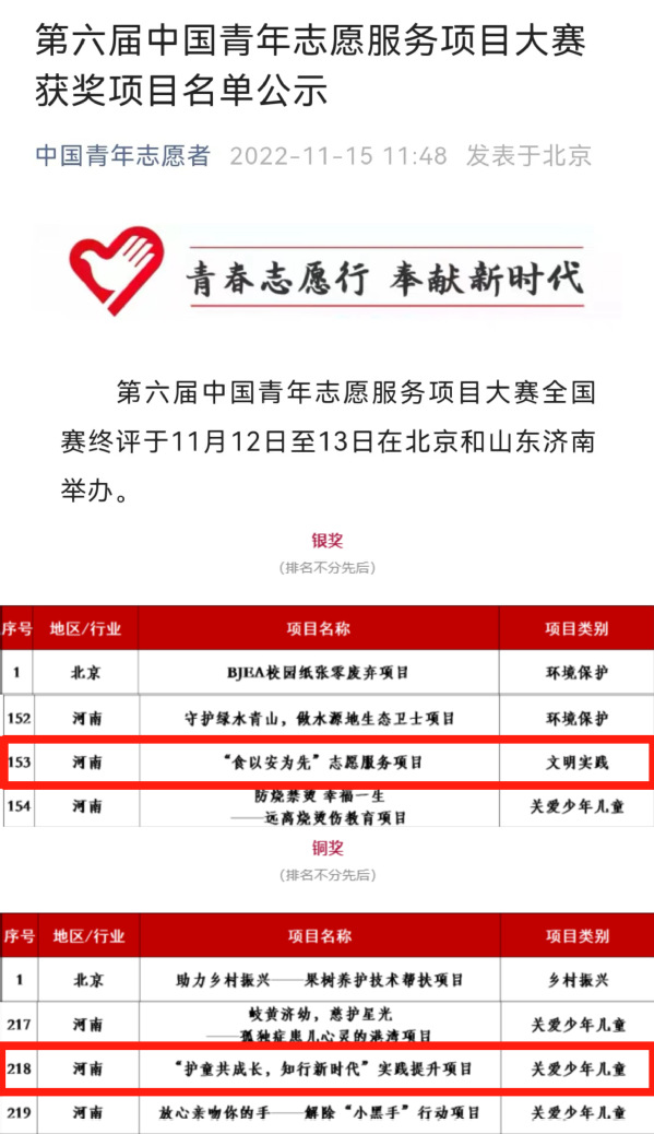 近年来,学校充分发挥专业和资源优势,组织广大师生深入开展理论宣讲、文艺体育、生态环保、法律服务、教育关爱和疫情防控等文明实践志愿服务,对接社会需求、强化科技合作,以项目化运作推动志愿服务常态化、专业化、品牌化建设。在前期河南省志愿服务项目大赛决赛中以上两项项目均获金奖,接下来,学校将深入学习贯彻落实党的二十大精神,进一步发挥志愿服务实践育人功能,引领广大青年为推动文明校园、文明河南建设做出应有贡献、奏响奋进强音、绽放青春光彩。(通讯员:王银峰、李燕)