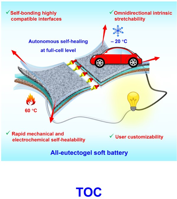 全电池自发自愈合、全向本征高拉伸全低共熔凝胶软电池的设计构筑