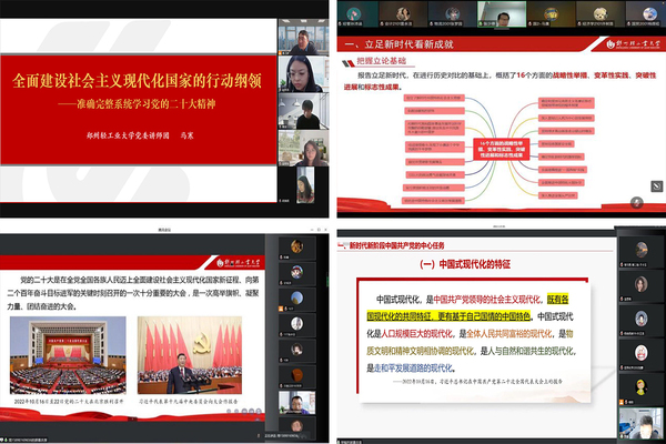 在校团委、经济与管理学院、马克思主义学院、外国语学院等单位,党委讲师团成员分别以“全面建设社会主义现代化国家的行动纲领—准确完整系统学习党的二十大精神”“以中国式现代化推进中华民族伟大复兴”等主题,用立足新时代看新成就;立足新问题看新思想;立足新征程看新任务;立足新环境看新战略;立足新形势看新斗争;立足逻辑主线看本质六个方面,引导与会人员系统把握二十大报告中提出的新观点、新论断、新思想、新战略、新要求。号召全体青年师生提升政治站位,坚决做到“两个维护”;提升党性品格,坚决做到令行禁止;提升斗争意识,坚决守好立德树人主阵地;提升能力作风,坚决做好、做优本职工作。