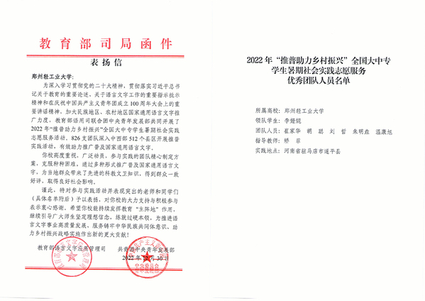 近日,学校收到教育部语言文字教育管理司、共青团中央青年发展部联合发来表扬信,肯定学校“推普助力乡村振兴--豫见游子吟”暑期社会实践团队师生发挥教育“主阵地”作用、助力乡村振兴战略做出的贡献。本次“推普助力乡村振兴”全国大中专学生暑期社会实践活动由教育部牵头发起,2022年全国共2989支队伍报名参加,全国共评出优秀团队165支,外国语学院师生组建的“豫见游子吟”教育关爱实践团队荣列其中。
