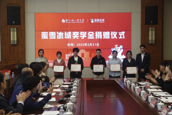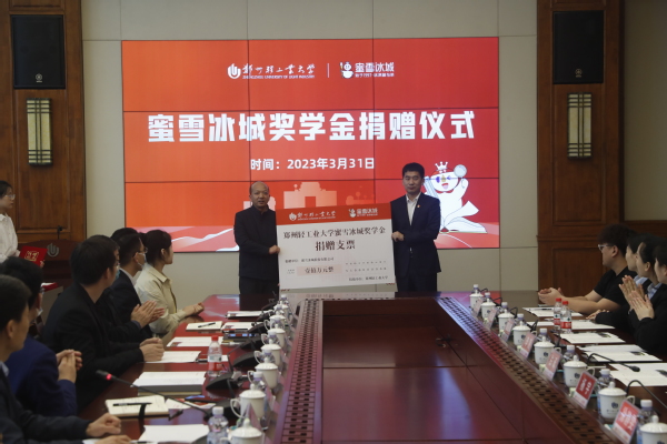 3月31日,蜜雪冰城奖学金捐赠仪式在学校科学校区双创中心第一会议室举行。蜜雪冰城股份有限公司向我校捐赠100万元,设立郑州轻工业大学“蜜雪冰城奖学金”。校长魏世忠亲切会见蜜雪集团副总裁白砥一行。副校长王延峰出席捐赠仪式,蜜雪集团有关部门负责人和校友代表,学校相关职能部门负责人、各学院分管校友工作干部、师生代表、校友联络办公室全体人员参加仪式。