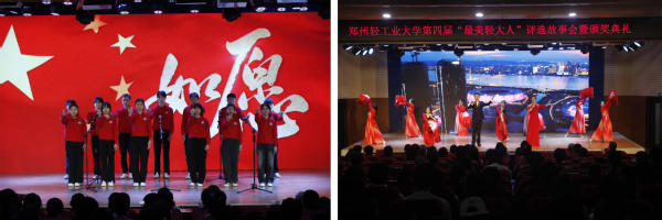 故事会上,档案馆教师郭彩峰、电气信息工程学院学科竞赛指导教师团队、全国劳动模范2008届校友范海报、高分子材料与工程专业“巾帼教研团队”、国旗护卫队、计算机与通信工程学院学生付朝鲜、校医院、机电工程学院教师王良文、附属学校教师王庆伟代表附属学校教师胡志伟、艺术设计学院“校友讲坛”参讲校友群体、体育学院教师袁文惠依次走上舞台,与大家分享了感人至深、动人心弦、催人奋进的“最美”故事,向大家传递了“大爱”的轻大精神和“大美”的轻大力量。由大学生艺术团合唱队演唱的歌曲《如愿》和由艺术教育中心教师、大学生艺术团舞蹈队共同演绎的歌曲《光荣》以诚挚的歌声、优美的舞姿展现出积极向上、不负韶华、勇毅前行为新征程奋斗的滚烫热情。