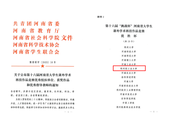 近日,共青团河南省委、河南省教育厅、河南省社会科学院、河南省科学技术协会和河南省学生联合会印发文件《关于公布第十六届河南省大学生课外学术科技作品竞赛优秀组织单位、获奖作品和优秀指导教师的通知》(豫青联字〔2023〕18号),学校参赛作品《鼓碳生烷——鼓泡流化阴极二氧化碳还原装置》《火眼金睛——一种智能巡检消防机器人》2项作品获省赛特等奖,同时获一等奖14项、二等奖20项、三等奖14项,获奖作品数量和层次较往年再创新高,综合积分位居全省高校第六名,学校再次捧得“优胜杯”。