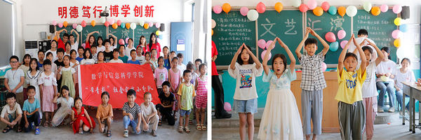 夏日筑梦暖童心,温情关怀助成长。数学与信息科学学院“常青数”暑期志愿服务队来到安阳市安阳县马家乡岭头小学开展活动,志愿者根据孩子们的切实需求,为学生制定美术工艺、安全教育、特色舞蹈、趣味国学、自然地理等兴趣小课堂;为乡村小学的假期教育增设美育教育环节,在国学课上引领孩子们学习中华传统美德和文化,在美工课上带领孩子们用自己丰富的想象力描绘出一幅幅美丽的作品;为孩子们创造一个展示自我的机会,由志愿者和孩子们共同排练的文艺汇演在当地小学举办,现场充满欢声笑语,热闹非凡,精彩的节目赢得了家长及观众的阵阵掌声。