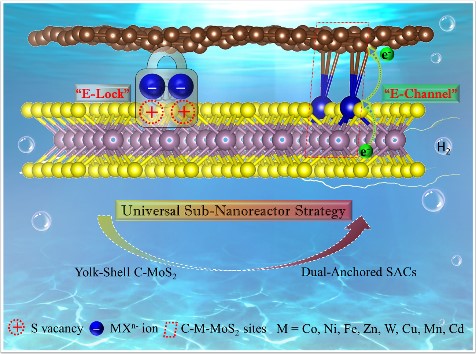 开发高效节能的电解水制绿氢技术对解决能源需求和实现“双碳”目标至关重要。单原子催化剂由于其高活性和最大化的原子利用效率受到广泛关注,然而,高表面能使得单原子在电催化环境中易聚集,影响催化效率和稳定性。调节单原子在碳基或非碳基载体上的配位结构可促进电催化选择性和活性,但精确合成具有空间位置以及构建兼具碳基和非碳基双配位微环境的单原子催化剂仍极具挑战。该工作提出一种通用的亚纳米反应器策略,将金属单原子限域在亚纳米空间内,精准构建系列兼具二硫化钼和插层碳双配位微环境的单原子催化剂,用于高效稳定电解水制氢,其中,C-Co-MoS2表现出优于迄今为止报道二硫化钼基单原子催化剂的产氢活性。