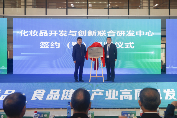 大会举行化妆品开发与创新联合研发中心签约暨揭牌仪式,张骁、陈功为化妆品开发与创新联合研发中心揭牌。