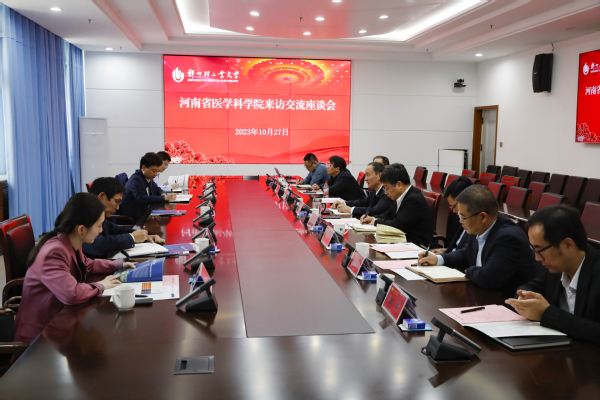 10月27日,河南省医学科学院专职党委副书记陈清江,党委委员、副院长曾军杰等一行来校交流座谈。校长魏世忠、副校长张骁出席活动,人事处、科技处、食品与生物工程学院负责同志参加活动。