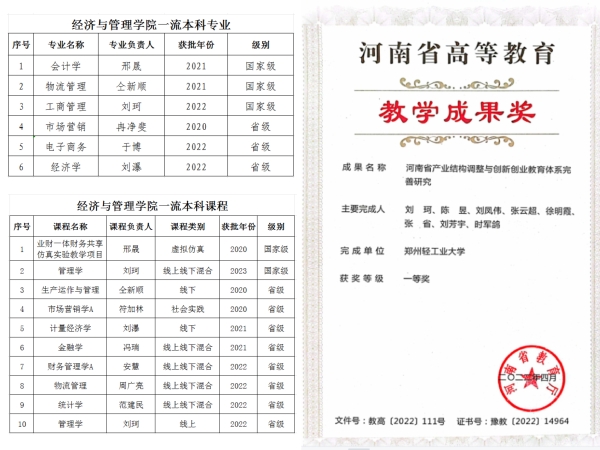 牢固树立本科教学中心地位,大力加强教学基本建设,持续推进教育教学改革,获批3个国家级一流本科专业建设点、4个省级一流本科专业建设点和1个河南省高等学校综合改革试点专业;获批2门国家级一流课程、9门省级一流课程和1个省级课程思政教学团队;获批3项省级教改项目、1项省级虚拟仿真实验教学项目和1个河南省大学生校外实践创新基地;获批河南省普通高校“十四五”规划教材3部,荣获1项河南省教学成果一等奖。