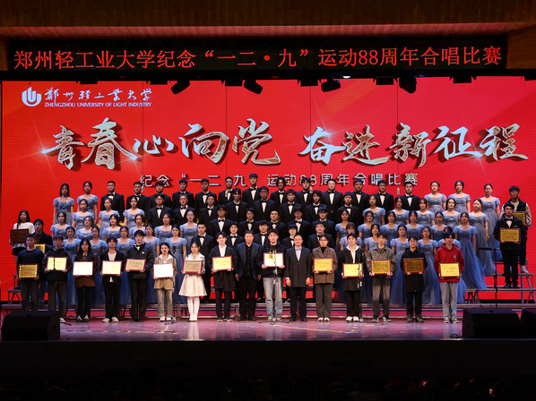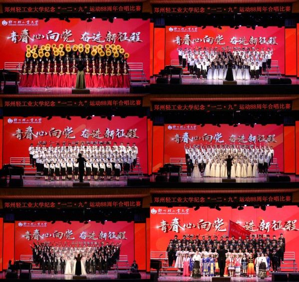 12月7日,郑州轻工业大学纪念“一二·九”运动88周年合唱比赛在东风校区大礼堂隆重举办。此次比赛邀请了省内高校声乐类专家担任评委,全校18个学院的代表队共计1600余名学生参加了比赛。校领导黄荣杰、孙爱芳、杨新宇、顾兴良出席活动,相关职能部门负责同志、各学院党委副书记、各学院团委书记及800余名学生代表观看比赛。