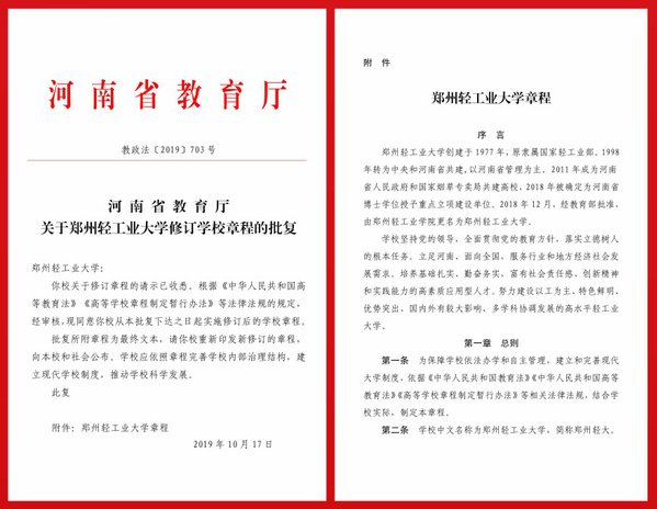 围绕建立现代大学治理体系,坚持“废改立”并举,修订完善制度150余项,以《郑州轻工业大学章程》为总纲的办学治校制度体系基本形成。