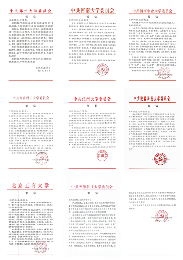 各高校在贺信中指出,郑州轻工业大学党委高举中国特色社会主义伟大旗帜,以习近平新时代中国特色社会主义思想为指导,深入贯彻落实党的二十大和省第十一次党代会精神,牢记为党育人、为国育才的初心使命,扎根中原大地,发挥特色优势,紧紧围绕国家、行业和区域重大发展战略,充分发挥人才培养、科学研究、社会服务、文化传承创新和国际交流合作五大职能,团结和带领全校党员干部和师生员工,砥砺奋进、开拓创新,学校党的建设和事业发展不断取得新突破新成效,为区域经济发展和高等教育强国建设作出了突出贡献。