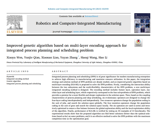 机电工程学院李浩教授和文笑雨副教授团队在工程领域国际顶级期刊《Robotics and Computer-Integrated Manufacturing》(中科院一区TOP期刊,影响因子10.4)发表题为“Improved genetic algorithm based on multi-layer encoding approach for integrated process planning and scheduling problem”(一种求解集成式工艺规划与车间调度问题的多层编码改进遗传算法)的研究论文。