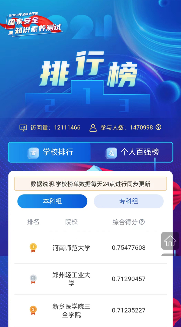 2024年是习近平总书记提出总体国家安全观10周年,此次活动旨在深入贯彻落实党的二十大精神和习近平总书记关于总体国家安全观重要论述,增强大学生国家安全意识和素养,本届活动主题为“总体国家安全观·创新引领十周年”,活动开展以来,学校高度重视,精心组织,全校学生积极参赛、踊跃答题,累计参与五场答题117528人次,掀起了学习国家安全知识的新热潮,经过与全省156所参赛高校激烈角逐,最终取得了优异成绩。