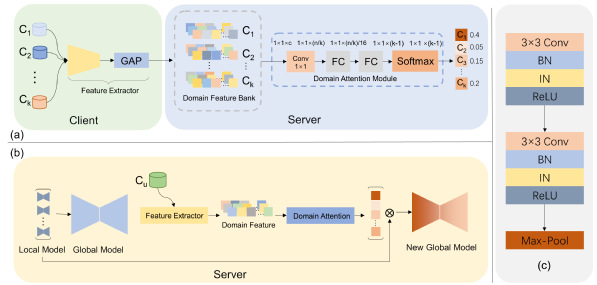联邦学习为跨中心医疗协作和数据共享提供了一种有效的隐私保护机制。在多站点医学图像分割中,联邦学习允许每个医疗站点作为客户端,形成自己的数据域,从而可能提高模型在已知域上的性能。然而,由于不同域中数据的非独立同分布特性,导致模型在不可见域的泛化(域泛化)性能下降。为了应对这一挑战,朱付保教授团队提出了轻量级的模型级注意力(MLA)和风格归一化模块(BIN)来解决联邦学习中的域泛化问题。MLA模块将未知域表示为已知域模型的线性组合。MLA不需要访问原始数据,而是在已知域的数据特征中充分探索学习,从而识别域间数据特征的差异,使全局模型从可见的域泛化到未知域。在BIN中,结合批归一化和实例归一化特点运行在分割网络的浅层以进行风格归一化。BIN与分割骨干网络结合,在无需访问其他中心数据的情况下,确保了域内特征的有效学习和域间图像风格归一化。实验结果表明,所提方法优于目前最先进的方法。本方法为联邦学习医学图像分割模型的实际部署提供了新思路。