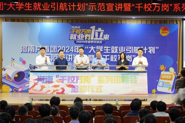 近日,由团省委、郑州轻工业大学主办,省青企协、智联招聘河南分公司承办的“河南共青团2024年‘大学生就业引航计划’示范宣讲暨‘千校万岗’系列招聘会”在我校科学校区举行。团省委二级巡视员王鑫出席活动并讲话,校党委副书记杨新宇出席活动并致辞。省人力资源和社会保障厅有关负责同志、智联招聘河南分公司相关负责同志、我校毕业生代表和来自全省的117家企业参加示范宣讲活动及招聘会启动仪式,现场提供工作岗位超过1600个。
