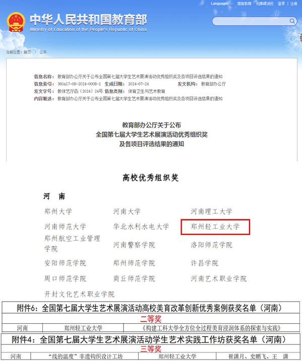 近日,由教育部和湖北省人民政府主办的全国第七届大学生艺术展演活动在湖北省襄阳市落下帷幕。经自主申报、省级推荐,国家级活动组委会专家评审,我校选送的《构建工科大学全方位全过程美育浸润体系的探索与实践》荣获美育改革创新优秀案例二等奖,“线的温度”非遗钩织设计工坊荣获艺术实践工作坊三等奖,学校获得教育部高校优秀组织奖,在获奖数量以及类别上均实现新的突破。