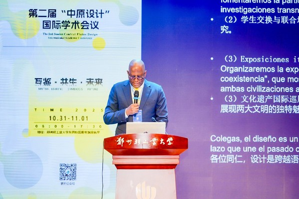 狄奥尼西奥•萨尔迪瓦尔•席尔瓦致辞,对会议的召开表示热烈祝贺。此次会议以设计为纽带,汇聚全球智慧,必将为艺术、设计与文化遗产领域的创新与合作注入新的活力。他表示,哈瓦那大学与郑州轻工业大学在设计教育领域有着广阔的合作空间,期待以本次会议为契机,深化设计学科人才联合培养、学术研究共建等方面的交流,共同探索设计服务人类美好生活的新可能。