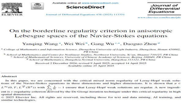 近日,数学与信息科学学院王艳青副教授在数学领域国际知名学术期刊《Journal of Differential Equations》(中科院一区TOP)上发表题为“On the borderline regularity criterion in anisotropic Lebesgue spaces of the Navier-Stokes equations(论Navier-Stokes方程在各向异性Lebesgue空间中的端点型正则性准则)”的研究论文。该成果以郑州轻工业大学为第一署名单位,王艳青为第一作者,与西北大学魏巍副教授、中国科学院大学吴刚副教授、杭州师范大学周道国副教授共同合作完成。
