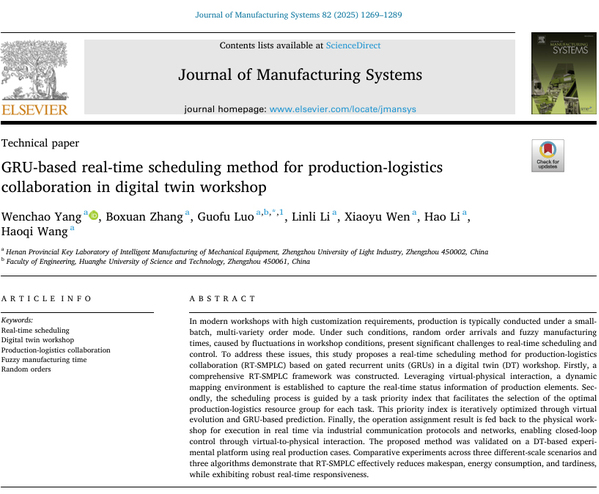 近日,我校机电工程学院李浩教授团队在智能制造领域国际权威学术期刊《Journal of Manufacturing Systems》(中科院一区TOP,影响因子14.2)发表题名为“GRU-based real-time scheduling method for production-logistics collaboration in digital twin workshop”(数字孪生车间下基于GRU的生产-物流协同实时调度方法)的高水平研究论文。机电工程学院青年教师杨文超博士为论文第一作者,罗国富教授为论文通讯作者。