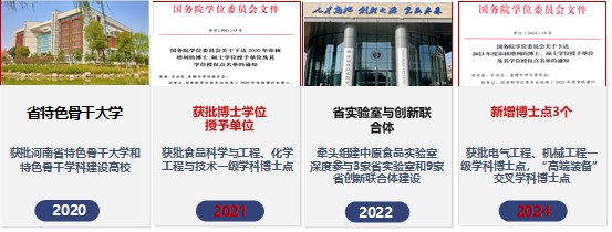 学校以“四个面向”为基础,秉持“创一流、强特色、固基础、促交叉”的理念,持续推动学科转型升级。构建了高峰学科、高原学科、基础学科、新兴学科“四轮驱动”的学科体系,支撑学校成功入选河南省特色骨干大学建设高校,获批博士学位授予单位。目前学校建有“食品科学与工程”“电气装备智能制造”“氢能科学与技术”3个河南省特色骨干学科群,高端装备、人工智能等22个新一轮省级重点学科。牵头组建中原食品实验室,深度参与“嵩山”“龙门”等3家省实验室和9家省创新联合体建设,为高层次人才培养提供系统性支撑。依托优势学科,学校先后获批2个博士后科研流动站,4个博士学位授权一级学科,1个博士学位授权交叉学科,构建了完善的本科、硕士、博士以及博士后人才培养体系。