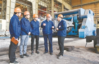 魏世忠(右二)在中信重工机械股份有限公司和工程师讨论技术方案。
